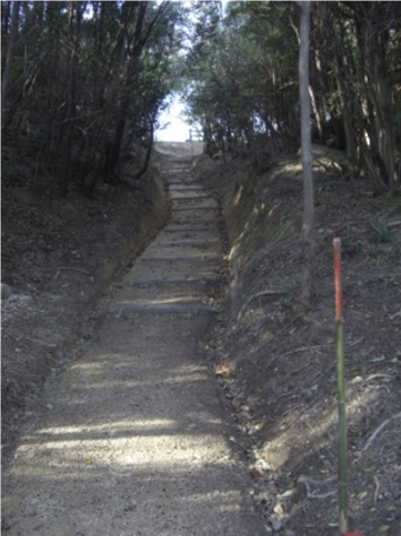 明照寺の東側の坂を上っていくと、玉祖小学校があり、その背後の山麓には沢山の古墳が発見されています。案内説明板とその坂道 向山古墳群への坂道
