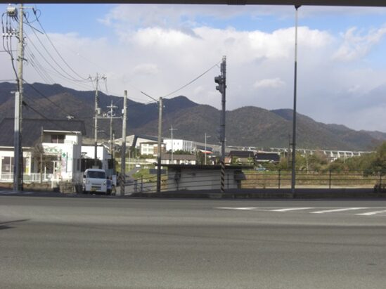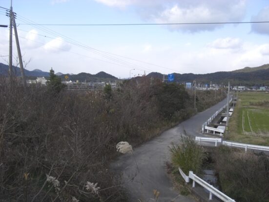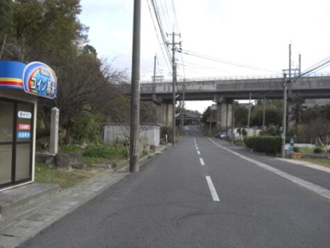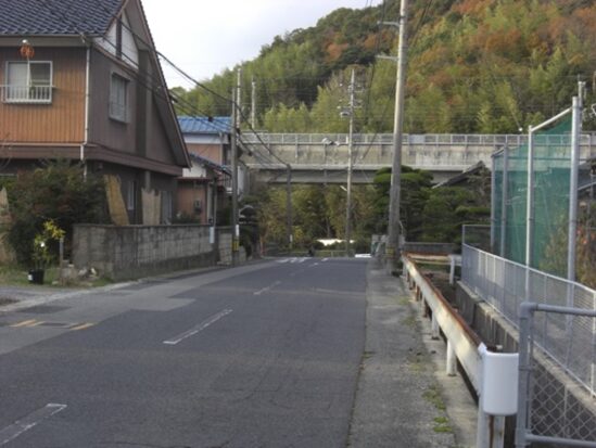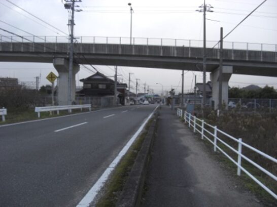 少し先に歩道橋が架かっています、歩道橋のすぐ左に山陽本線の四辻駅があります。