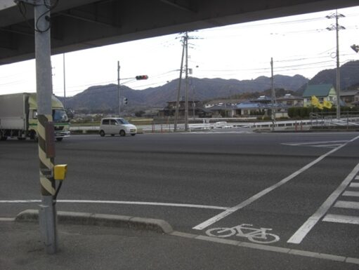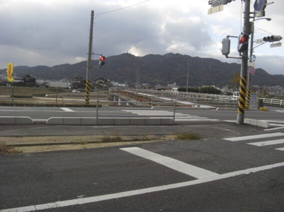 元の駅北側の歩道橋のある道路に戻り西に進みます300m程進むと変則の四辻に出ます。四辻のところで金毛川を渡りますが、道は分岐して、山陽道は左斜めの道で高橋橋を渡ります。右の道は国道2号線の高架の下にでて四辻橋を渡り四辻信号交差点に出ます