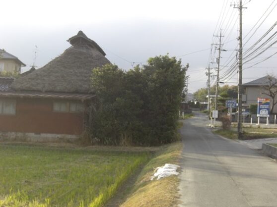 その先左に街道情緒をかもし出す空き家のようです 茅葺の古民家