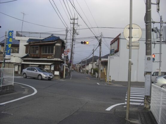 街道に戻り少し先に進み、左角に久野文具店がある信号交差点に出ます。その交差点を右に折れて進むのが、ここで山陽道と分かれる道、萩往還 で山口市から萩への道。幕末・維新には勤王の志士達が歩いた道です。山陽道は真っ直ぐ西に進みます。