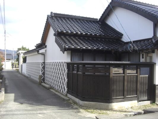 十字路右北角の旧家、この角に 高札場 があった。十字路の越えた左辺りに 小郡天下御物送場跡等 があった