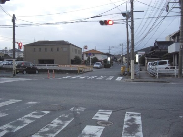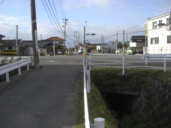 小川の横の信号交差点を振り返ったところです。小川の手前右にビューティハウスひかりがあります