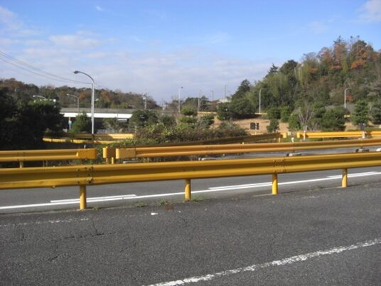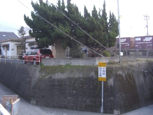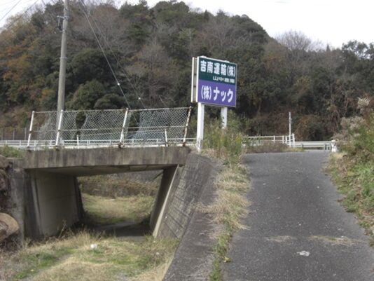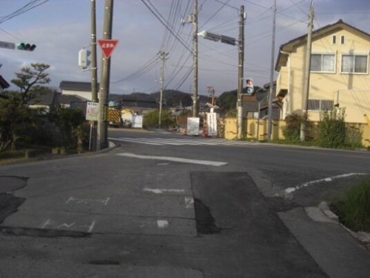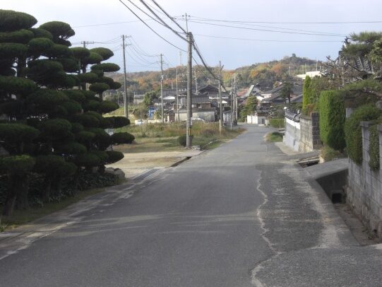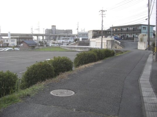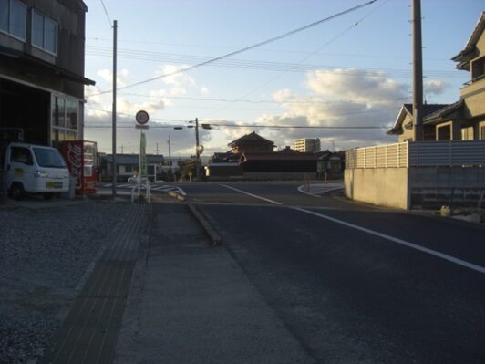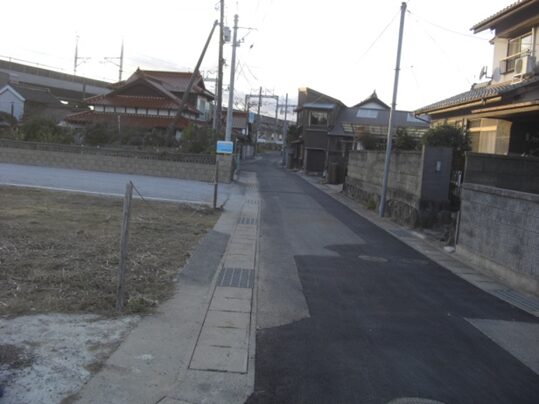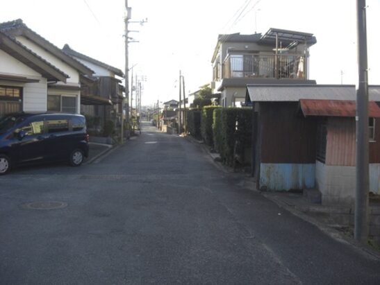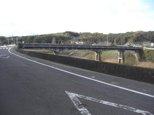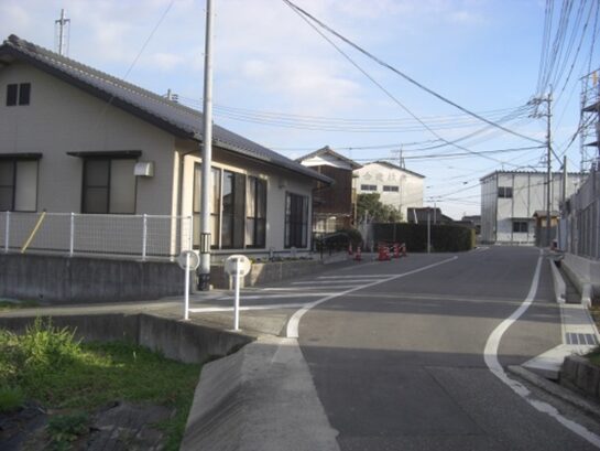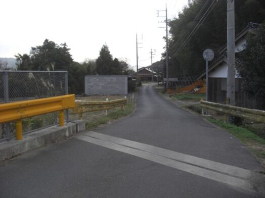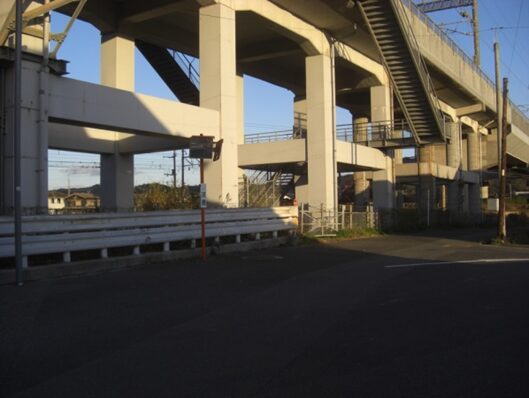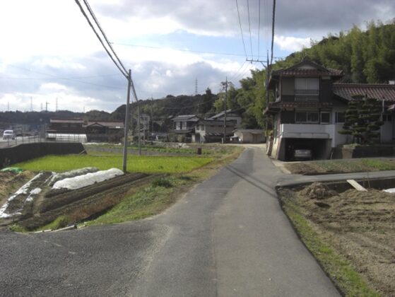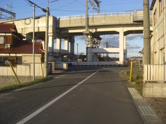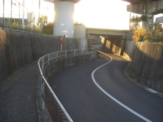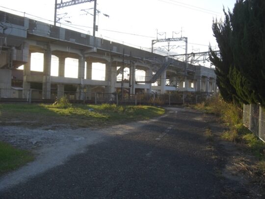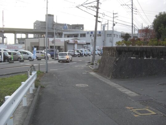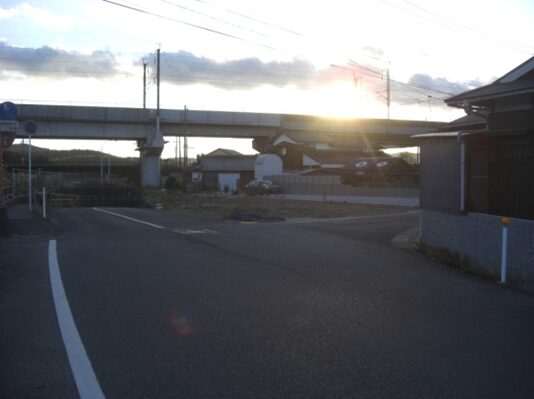 すぐ先右に壱岐建材店があるところで、山陽新幹線の高架に突当りますので左に折れて、すぐに分岐を左斜めの道を進む(高架沿いの右の道でない)