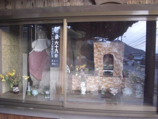 交差点右に入ったところすぐ右に、柏崎新開公民館の敷地内に多賀大明神の小さな 祠と嘉川観音霊場69番 が一緒に収められています