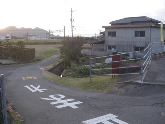 その先、右の山陽本線に接近したところで十字路に出ます、左に行くと宇部線の上嘉川駅に出ます。十字路を右に折れて山陽本線の踏切を渡ります