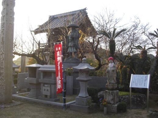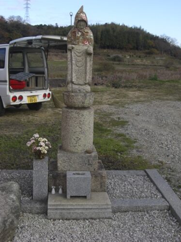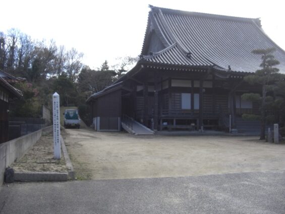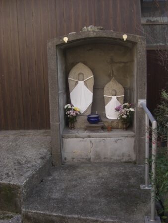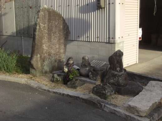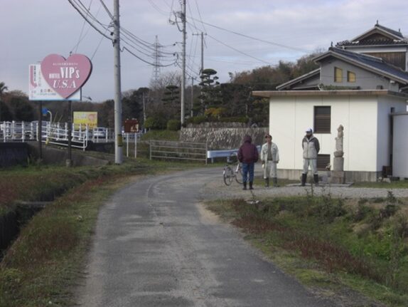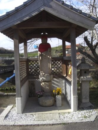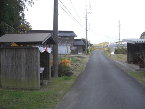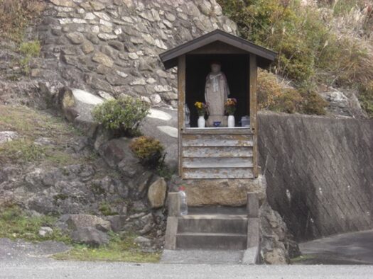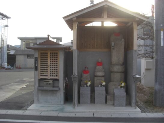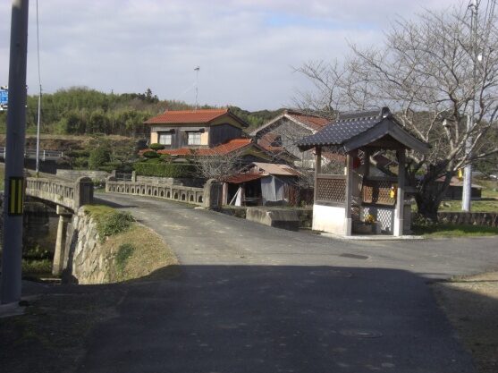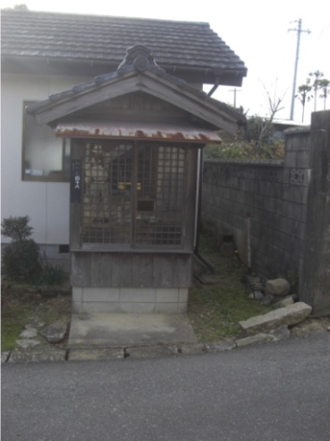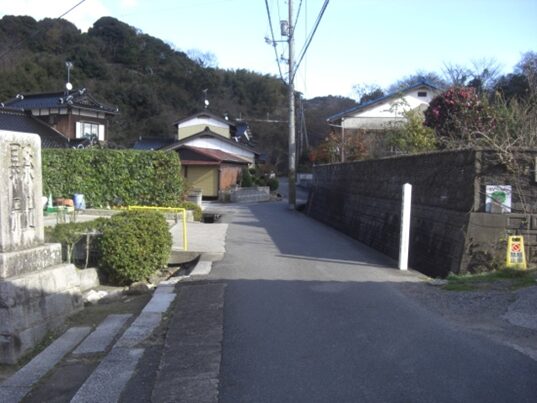 右角の 大師堂 を振り返る 札所六十四番霊場、正徳三年(1713)の立像と二体の石仏が並ぶます。車道を横断、斜め左に入る旧道があります