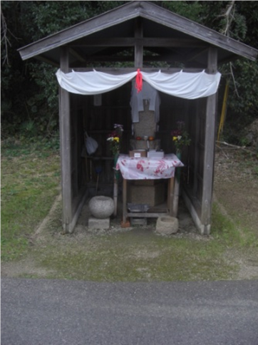 やがて355号線の山口市嘉川福岡信号交差点に出ます。交差点右角に 祠 があります