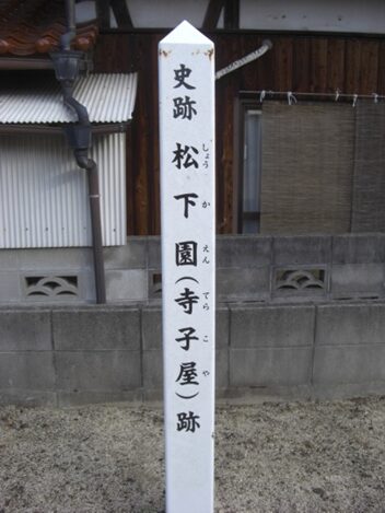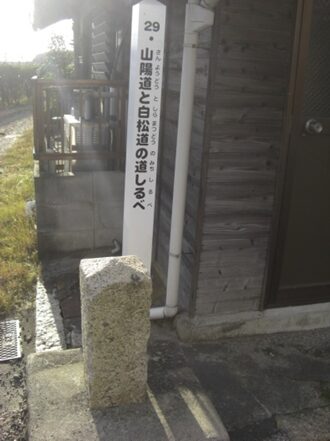 橋を渡った左の民家の傍に 道標 (刻まれた文字は読めない) 山陽道と白松道の道しるべの標柱