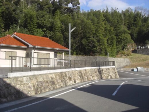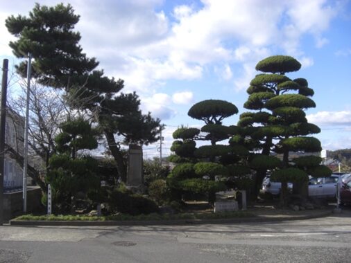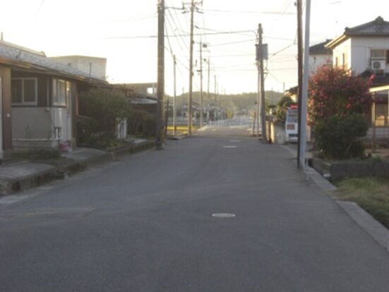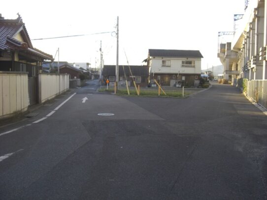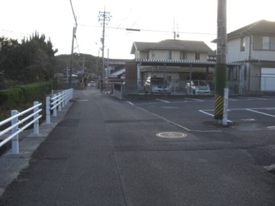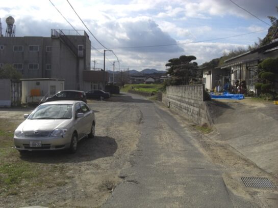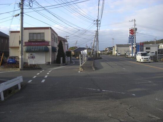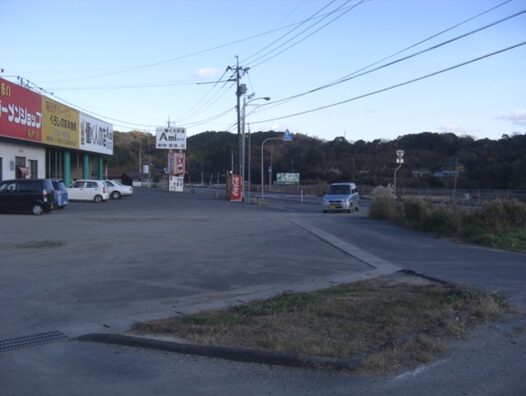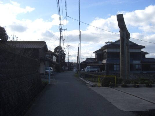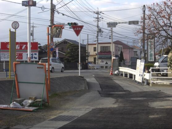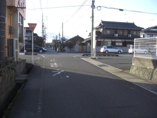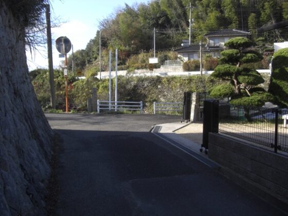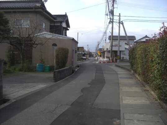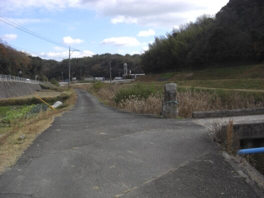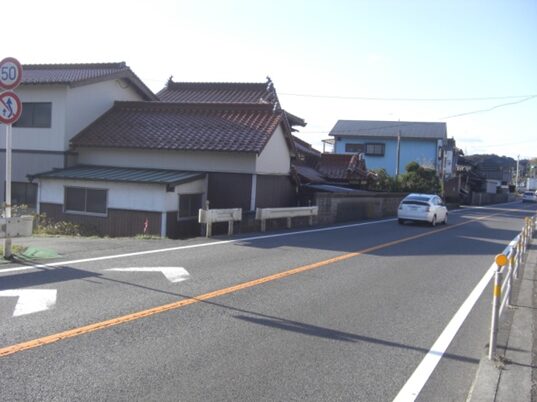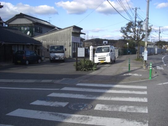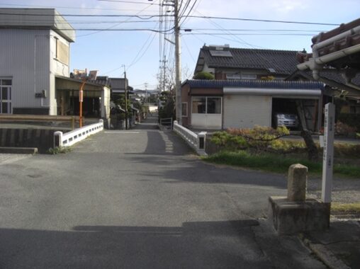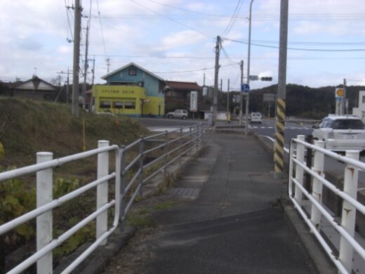 橋の西袂から260m程進んだところの左T字路で旧道は右に折れていました。途中右に村上石材店、小公園があります
