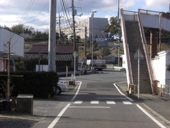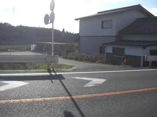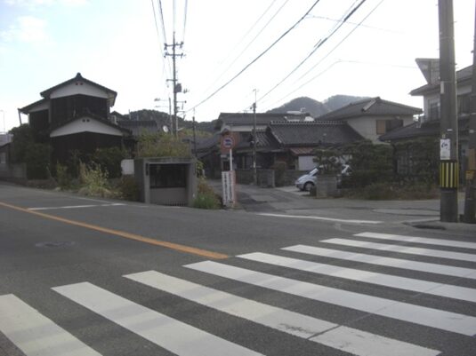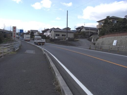 国道に合流したところで、左角辺りが 寺小屋跡か。国道の歩道右側を進んでいきます