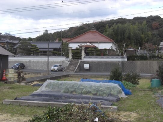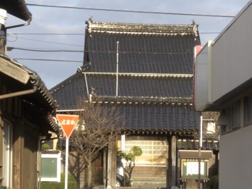 右335号線の向こうに大きな屋根の 浄土真宗本願寺派明正寺 が見えます