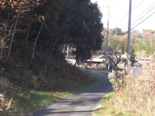 すこし進んだ先、茅葺をトタン屋根で覆った民家の手前で、少し右に折れて入り335号線を越えた先の三叉路に