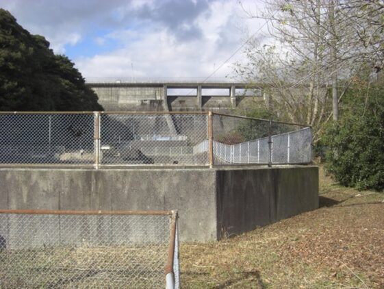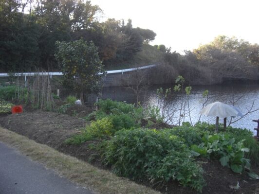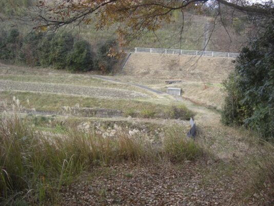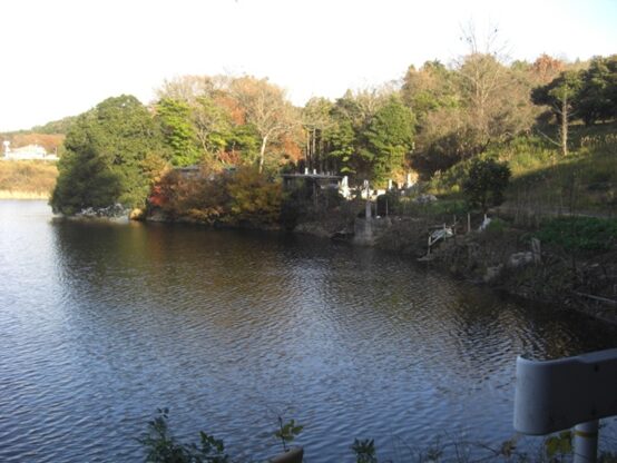 池の西側から巻いてきた池の堤の旧道・墓地を見る