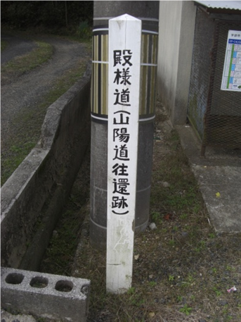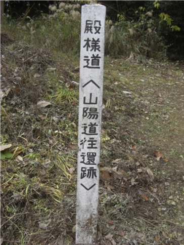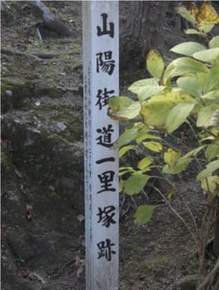 左に下る右ガードレールの傍に 西見峠一里塚跡碑 「旧山陽道」と刻まれている