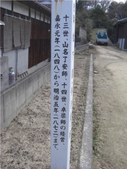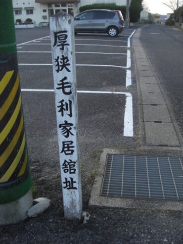 角の駐車場道沿いに 厚狭毛利家居舘址の標柱 関ケ原の戦い後、長門厚狭に10500石で毛利元就の五男元秋が祖としたのが始まり