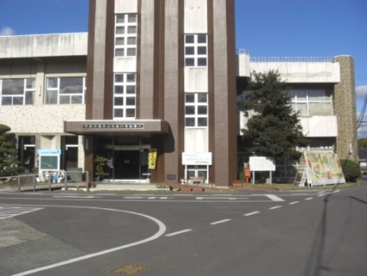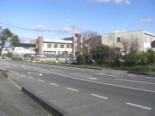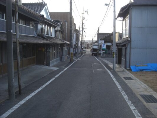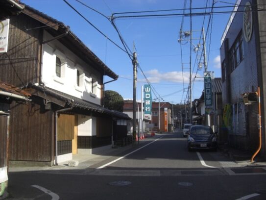 交差点を越えた先の厚狭の街並み十字路を左(南)へ行くと厚狭高校南校舎があります、そこはかつての 厚狭郡家跡でいた