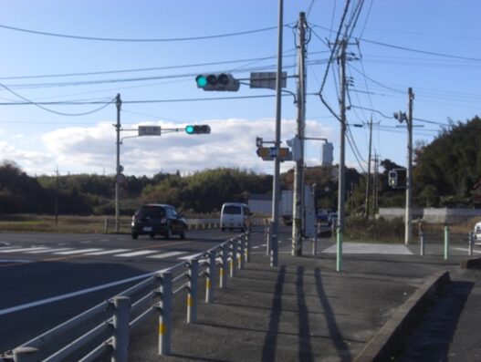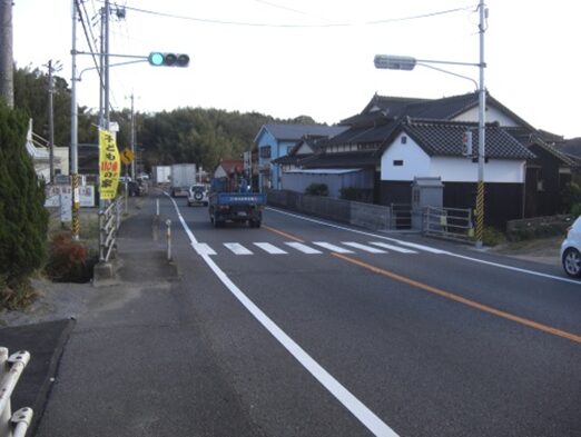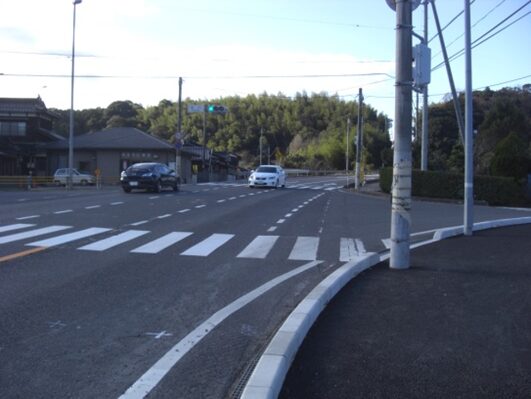 国道の広い歩道に出ます、ここで横断歩道がありますので渡ります
