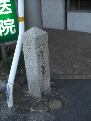 橋の西袂に戻り川沿いを左に折れる吉武医院の角に 道標 「右 あつ 左 はぶ下の関」