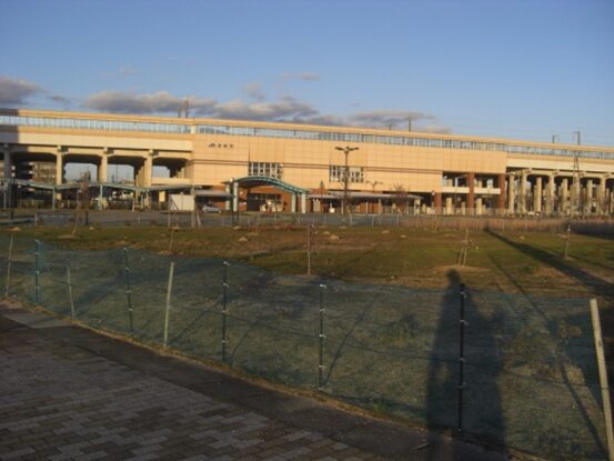交差点右を見ると、山陽新幹線・山陽本線の厚狭駅が見えます
