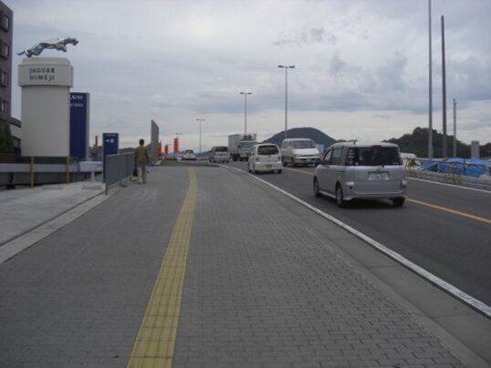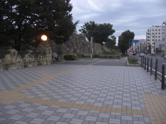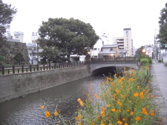 T字路を右に折れた100m程先で国道2号線に出ます、横断ができないので少し右(東)に折れると白鷺橋の信号交差点にでますので、船場川に沿って左に折れて2号線を横断します。この辺りは姫路城の 埋門跡