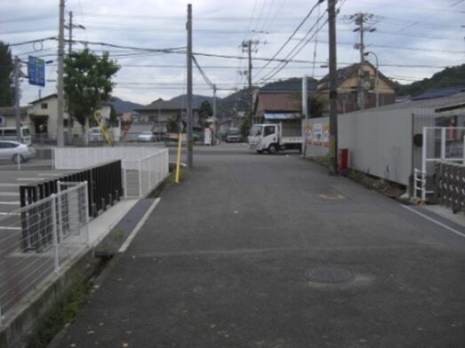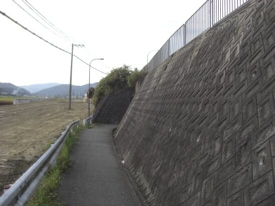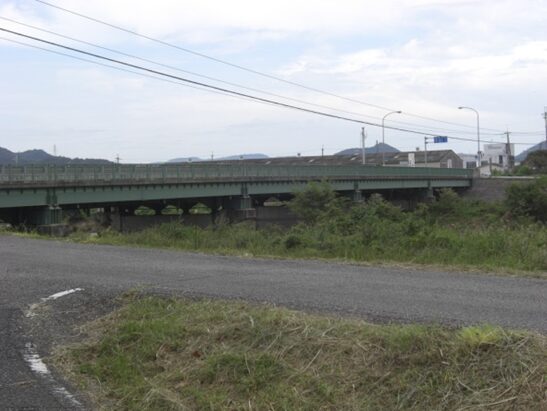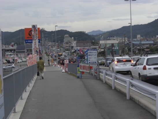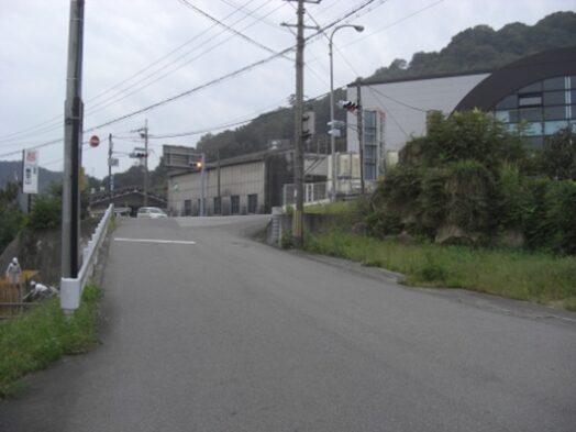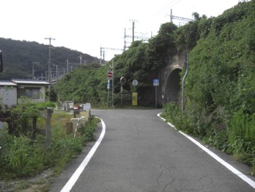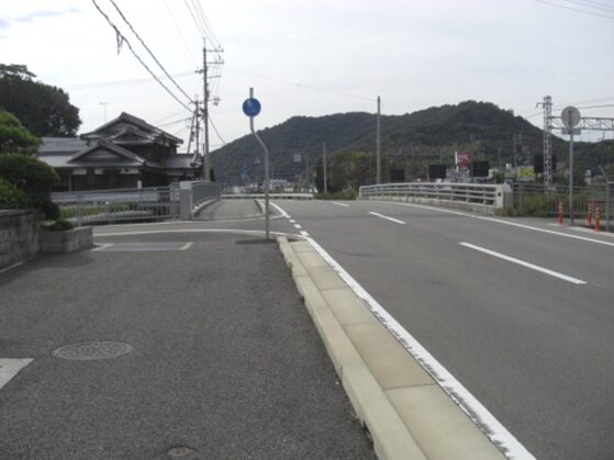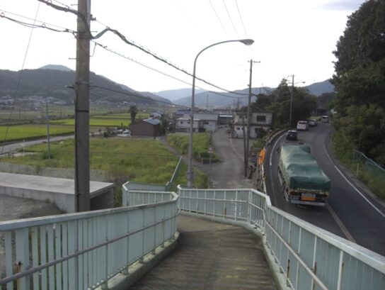 残念ながらどのような状況か写真に撮れていません、とても余裕がなかったので残念。迂回道と行っても,川と線路で遮断され遠いのでやむを得なくこの道しかない、雨ではとても無理です。山陽線の跨線橋を越えると右手国道と山陽本線の間に細い消失した前述の旧道が復活していますので右に出ます