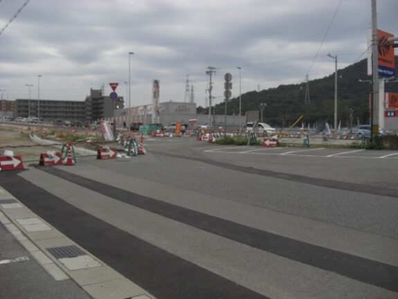 オートバックスの北側、2号線を挟んで右に入る旧道が復活します。道路工事中で少し分かりづらい