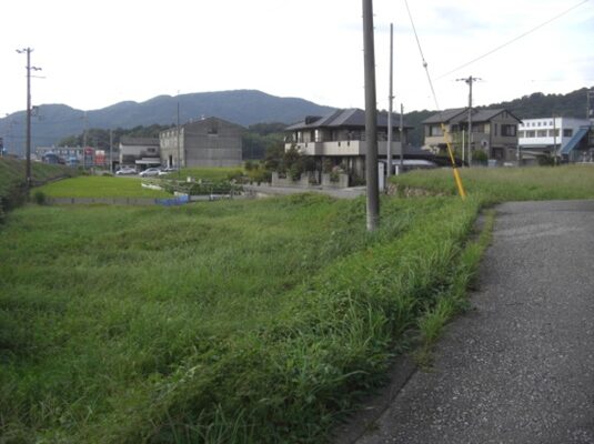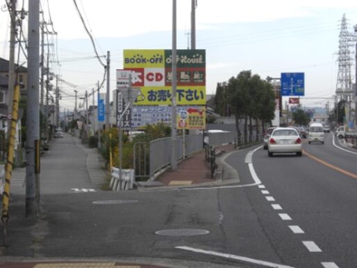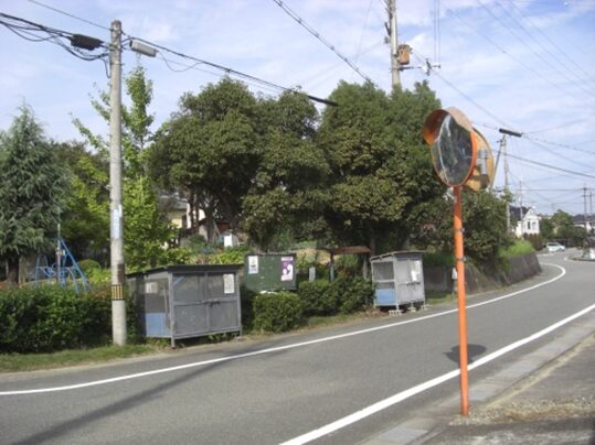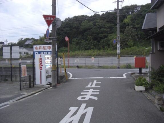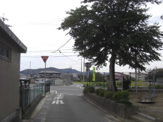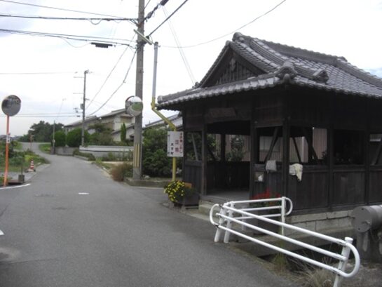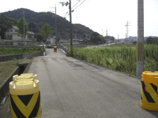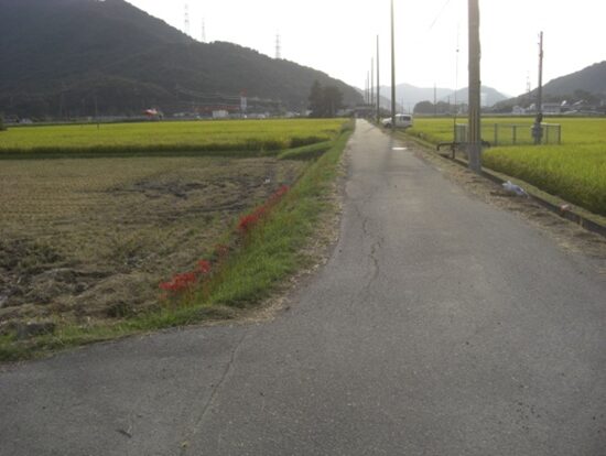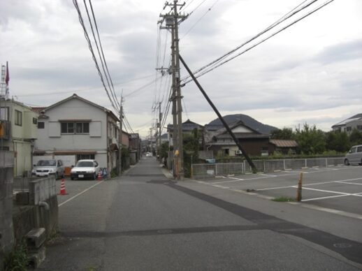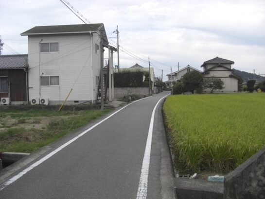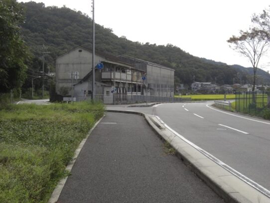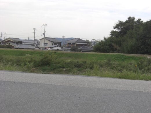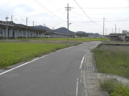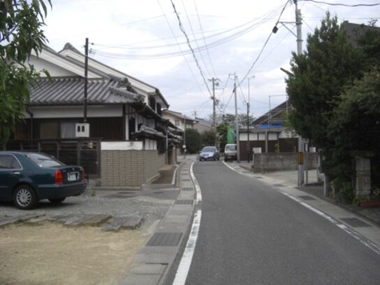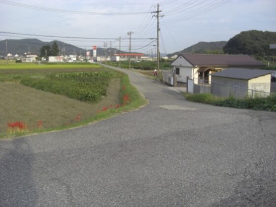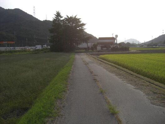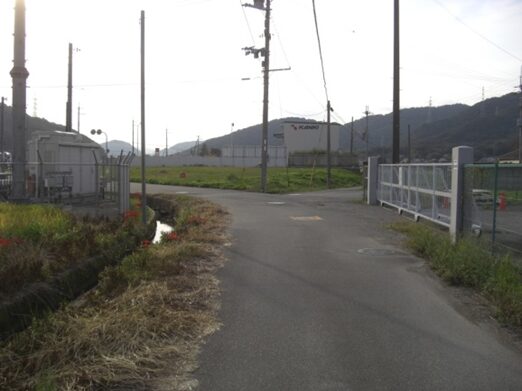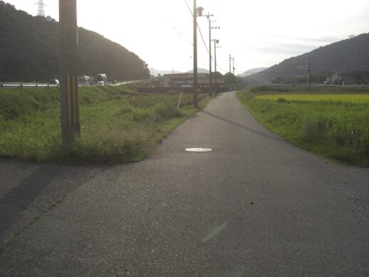 十字路を120m程先で道は分岐します。左の広い道を折れると数十mで国道2号線に出ますが、車が多く歩道がないので危険なので田畑の中の道を進みます。この先旧道ははっきり何処を通っていたか分かりません。分岐の所は関西電力の電柱置き場になっていました