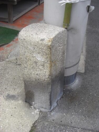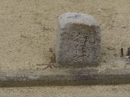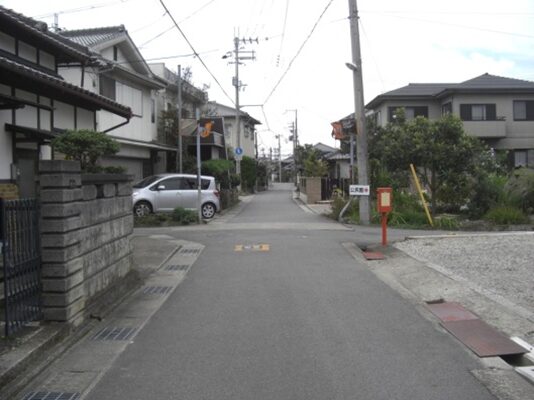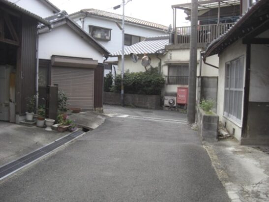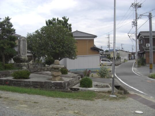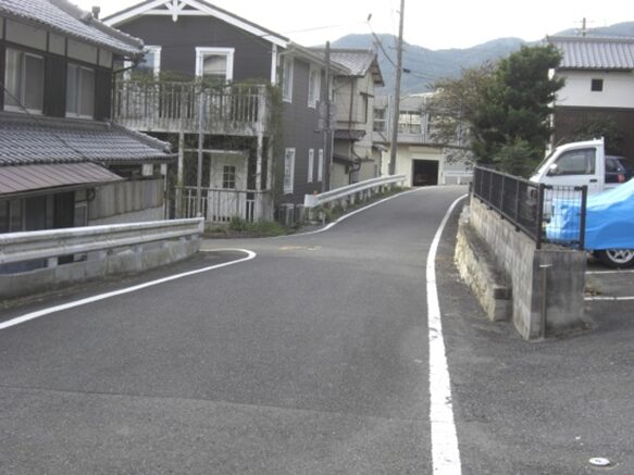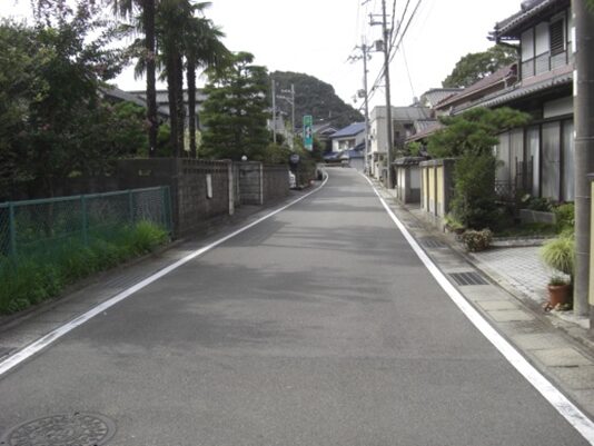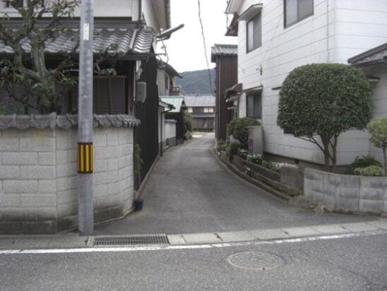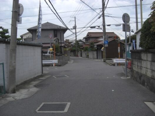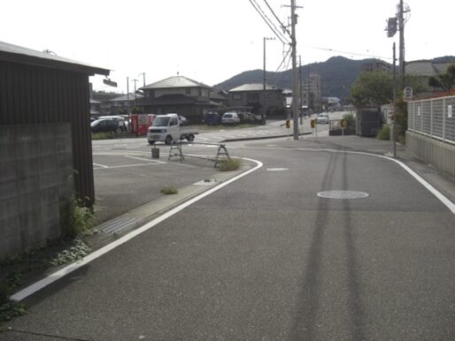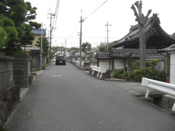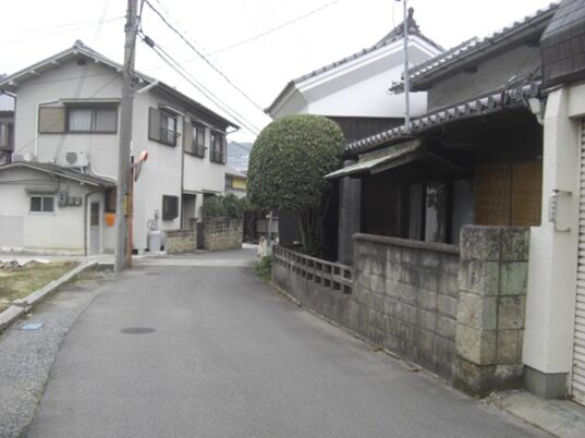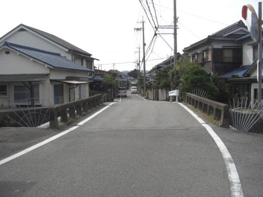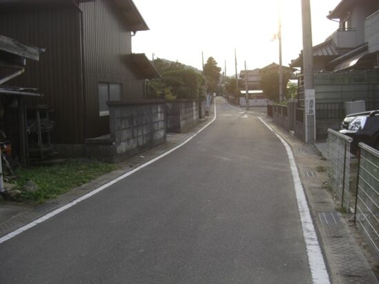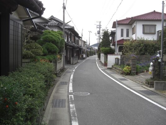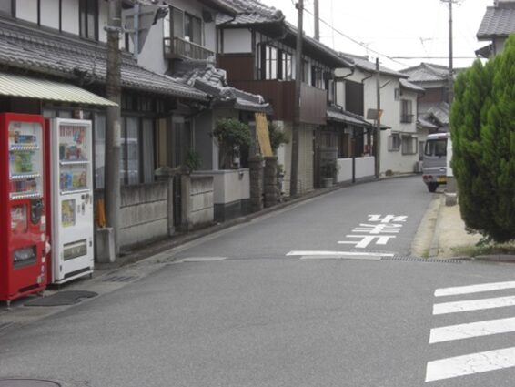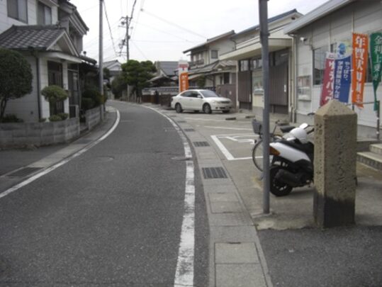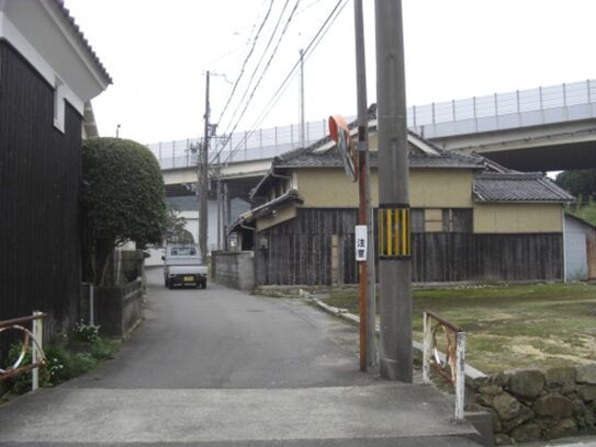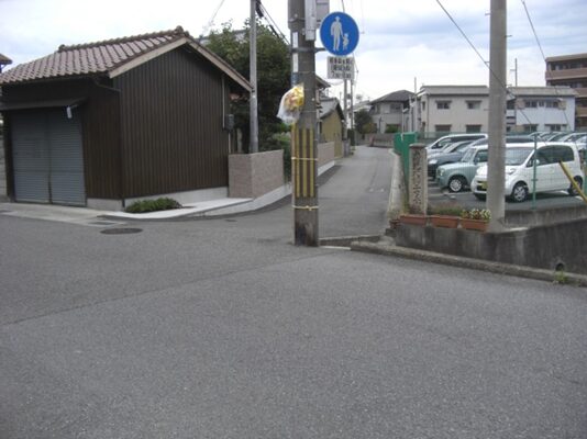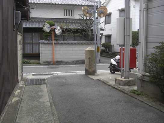 左に折れた街並みに入る左、この角の塀の中に船つなぎ石があったようですが見逃しました。左に折れて数十mで十字路に出ます、左が前述の横断できなかった国道です。十字路を右に折れます50m程進むと、右T字路を左(西)に折れます