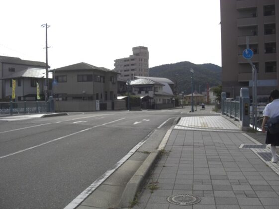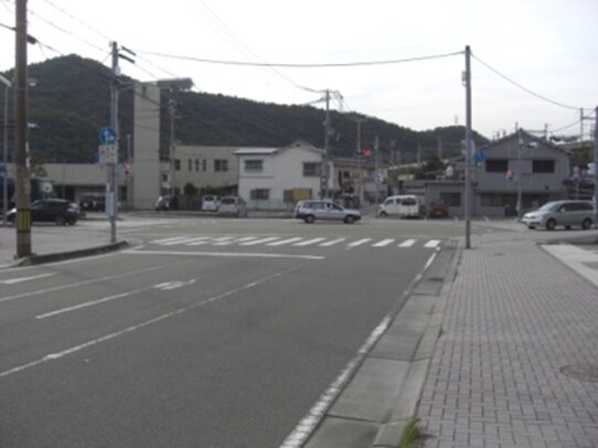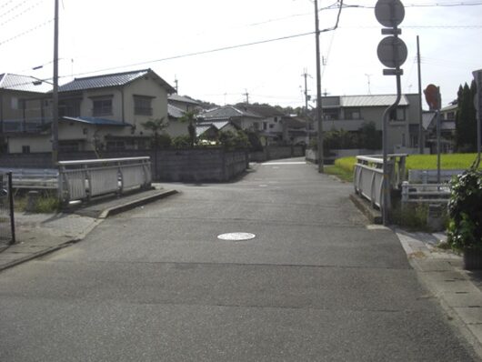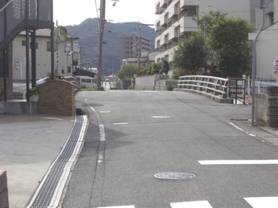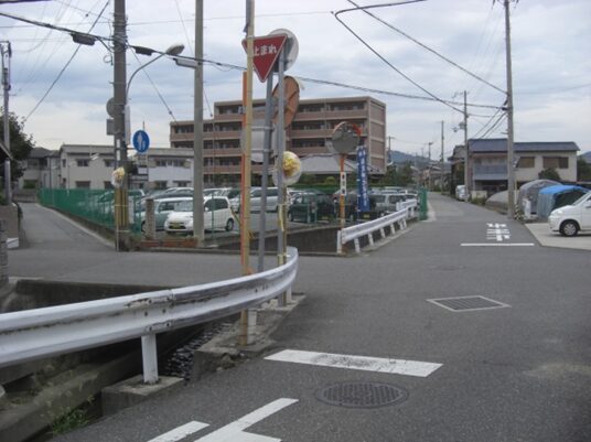 川を渡る橋の五差路を南側の道から見たところで橋を渡ったすぐ右角に