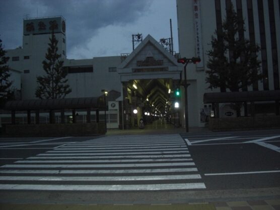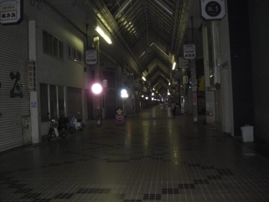 山陽道のアーケードの二階町商店街まだ朝がはやいので人通りもなく暗いです