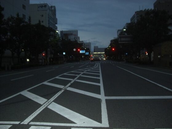 少し明るくなってきました、福中町を通り船場川に架かる橋を渡ります。すぐの広い道の信号交差点を横断したすぐ先のT字路を右に折れます