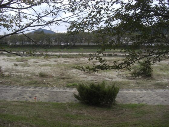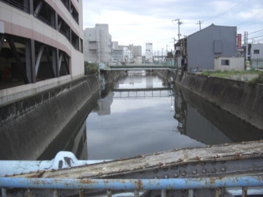 船場川を右にして数十mで左に折れて、前述の2号線の北側近くの道に出ます。船場川沿いに進んだところから2号線に架かる白鷺橋方向を振り返る