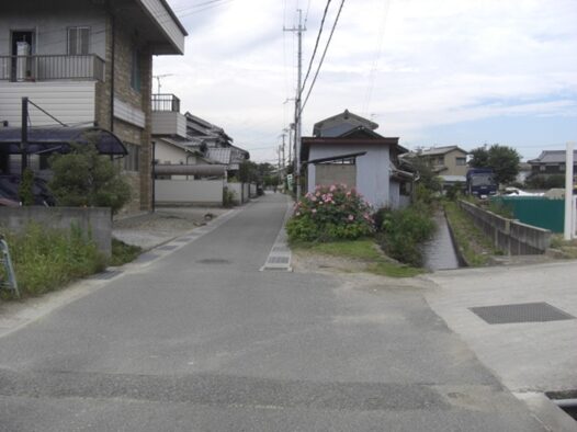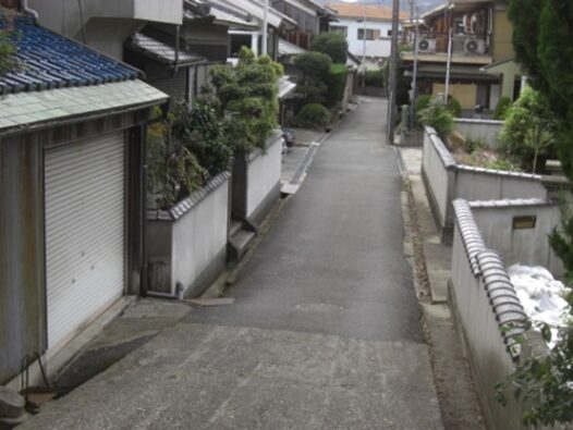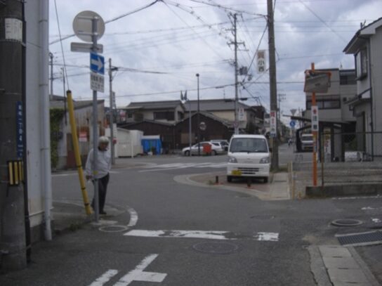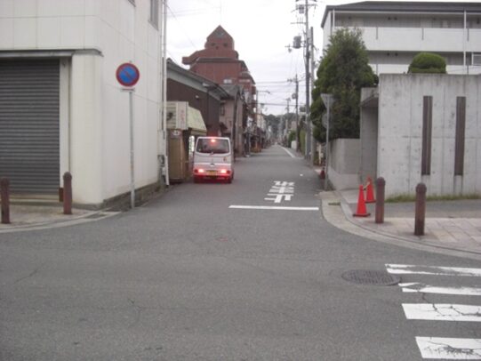左に折れて100m進んだところ左T字路で右に入る新道があります、右に折れたところから見たところ、街道は一方通行を右へ