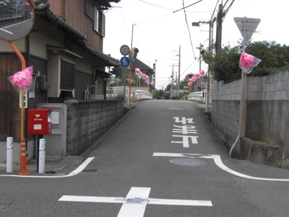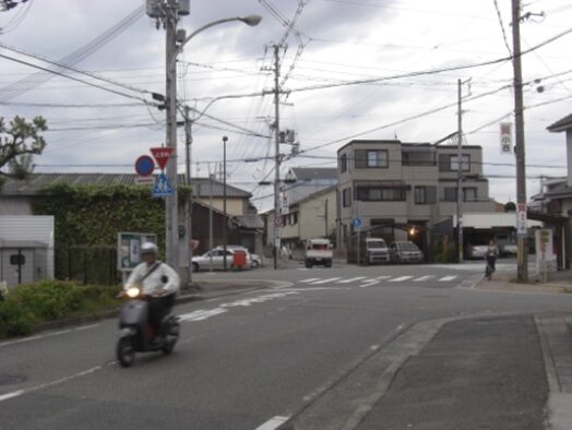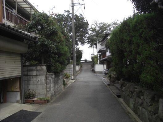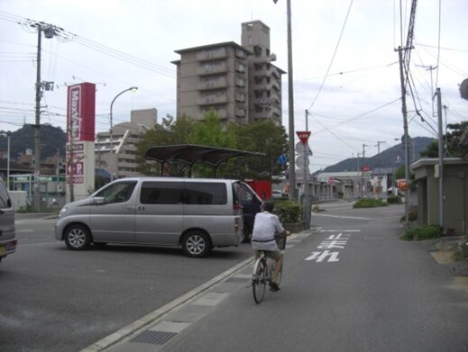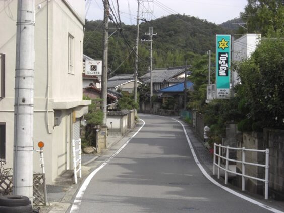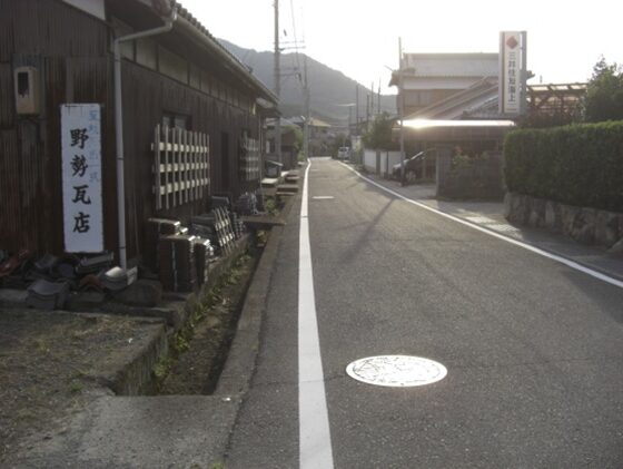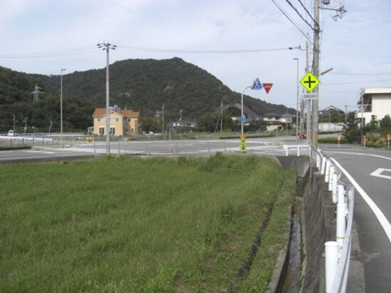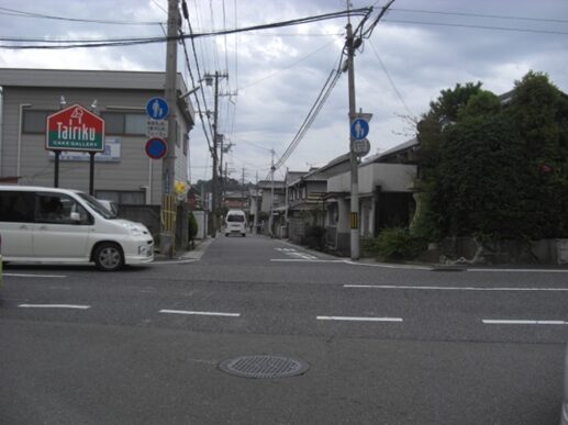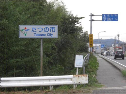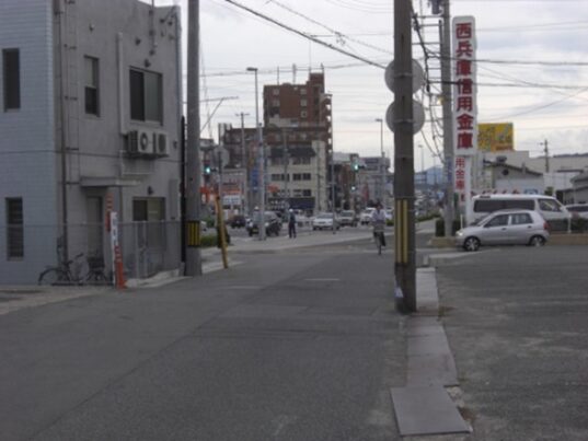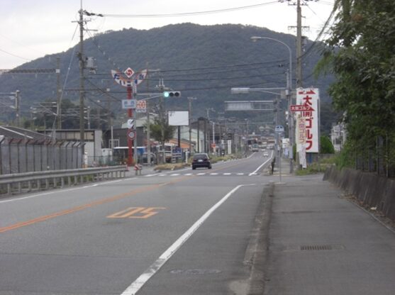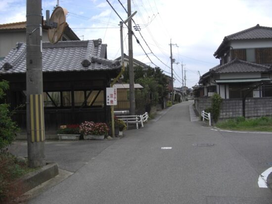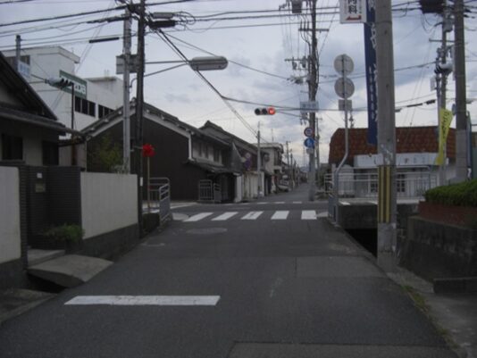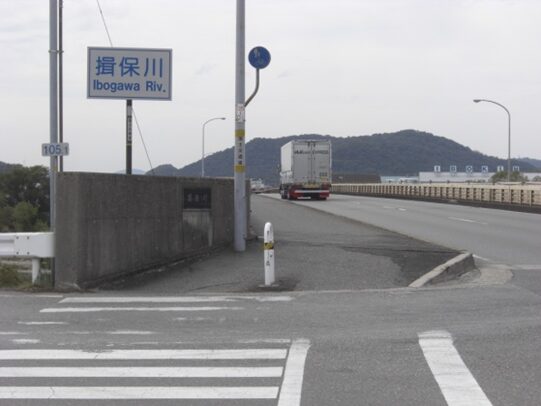 交差点で左に入る道がある白い車が出てきたところの街道は山陽道と分岐する 赤穂街道の起点 で忠臣蔵の早駕籠が走った道です(赤穂街道に詳細)。