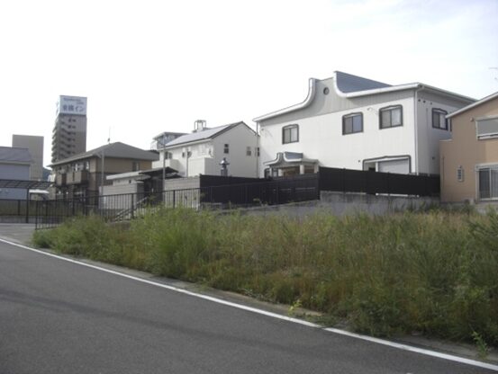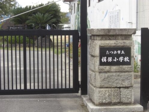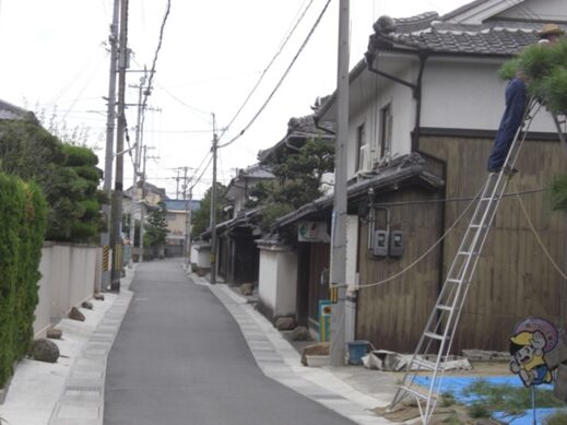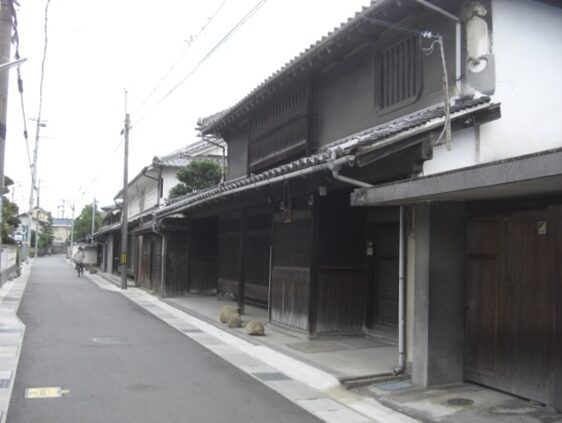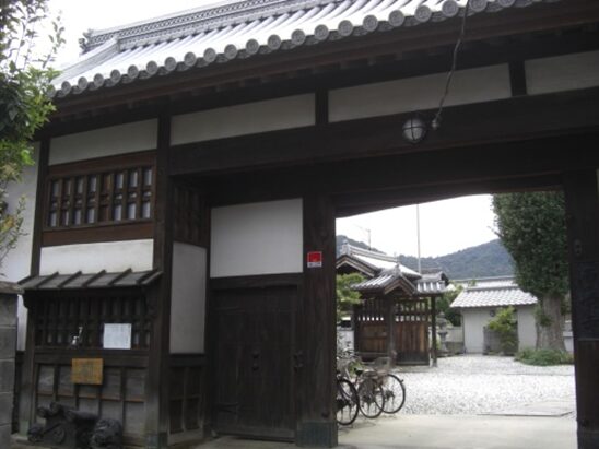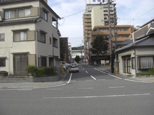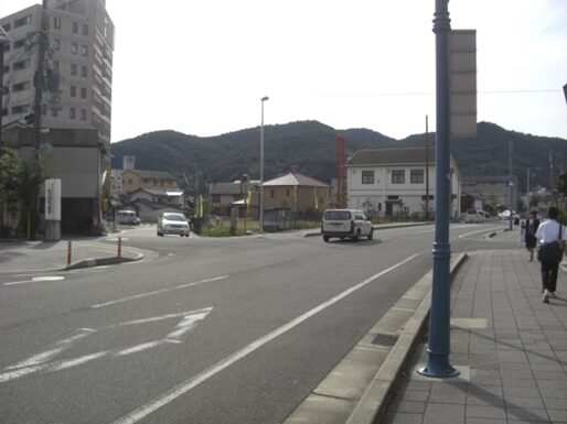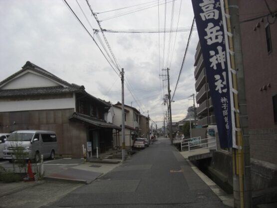 さらに進んで古い街並みを過ぎたところで左にダスキン今宿支店の前を進む、右に広い新道を越えて40m程で突当り左に折れます。ここは龍野町5丁目 正面飾磨県庁跡