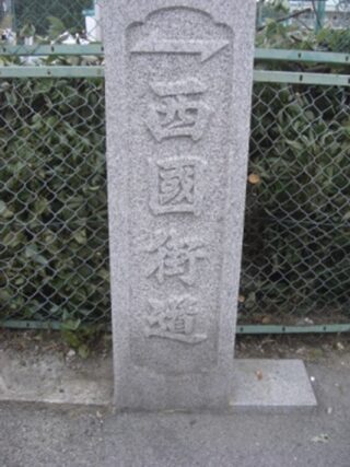左に折れる川(堀)沿いに立つ新しい西国街道の 道標