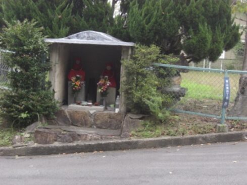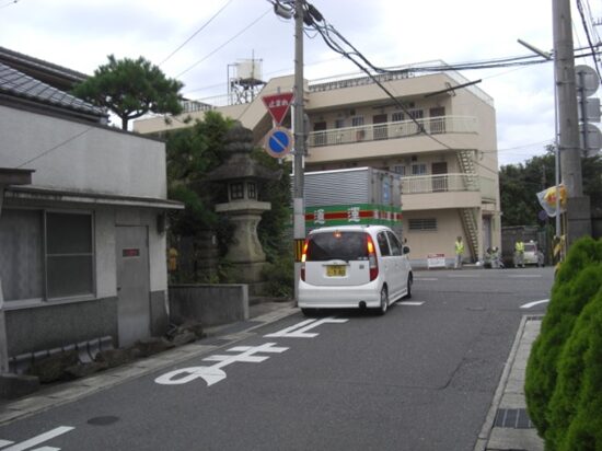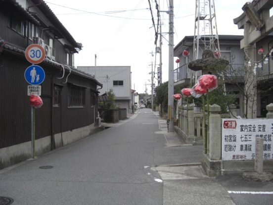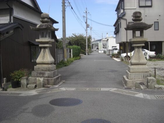 交差点の右に高岳神社への参道入り口に 灯籠が二基