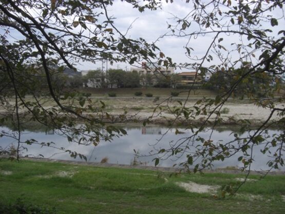 芋谷川に架かる橋を渡り少しの間ですが車の多い喧騒より逃れてホットする瞬間です。左(南)国道の向かいには鶴亀池が広がっています