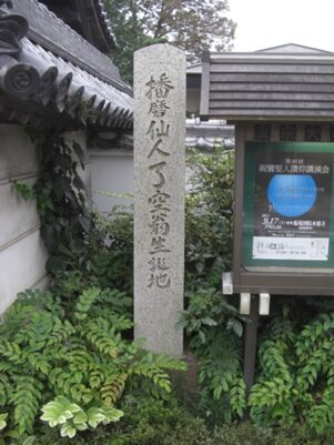 交差点を越えてすぐ小さな川を渡ると左に 教専寺 門前に 播磨仙人了空翁誕生地の碑