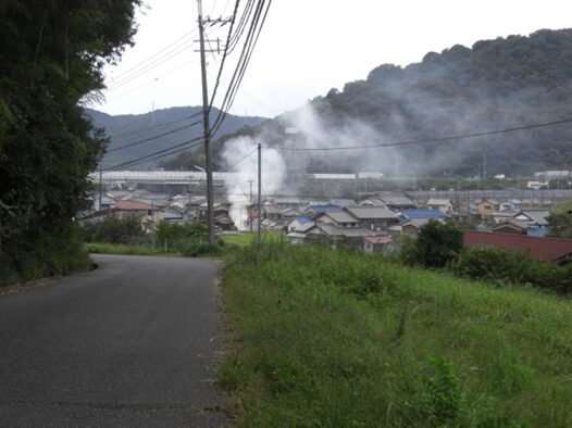福井集落を進みます左に能勢瓦店があります。瓦店の前から150m程進むと十字路になり、左すぐに国道2号線の福井信号交差点がありますが十字路を真っ直ぐ進みます