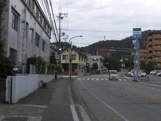 やがて青山西5丁目交差点にでると右角にはファミマがあります。かつては、信号のところで旧道は左斜めに進み山田峠(青山峠)に登っていたが、今は住宅地に変わり消失してるので迂回します