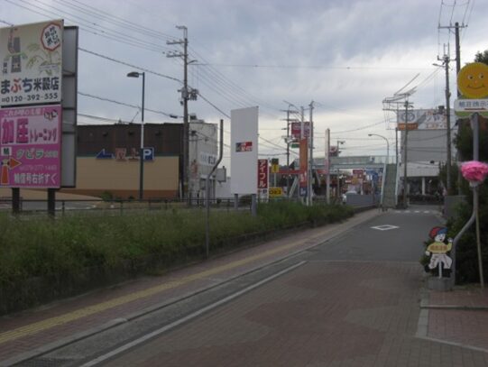 西に暫く進むと広い交差点に出ます街道は真っすぐ狭くなる道に入る。左に相生市民病民があります