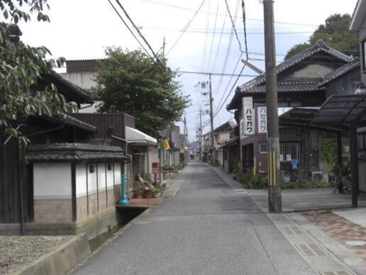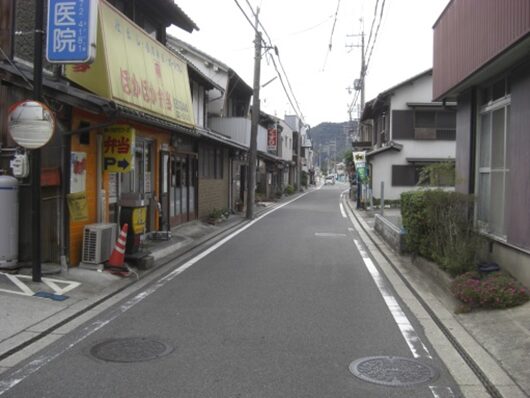 右T字路を左に折れて西に真っ直ぐ進む龍野町の街並みです