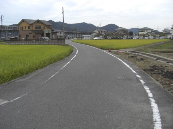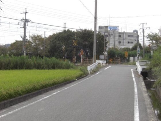右の田園の広がる道を分岐から100m程進み、右(北)に方向を変えて110m程進むとT字路となり左に折れました。T字路を左に折れて真っ直ぐの道を220m程進むと十字路になります