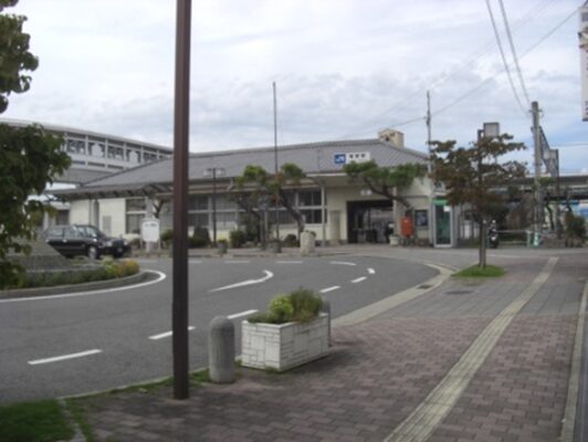 十字路から250m程集落を進むと交差点にでます。右を見ると国道を横断するとすぐ、JR有年駅です。