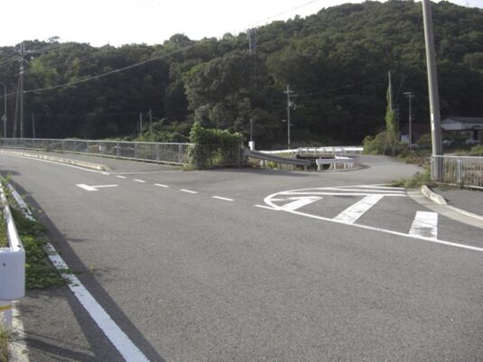 左から広い新道が合流して分岐しています、旧道は斜めに横断して進みます