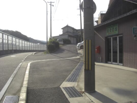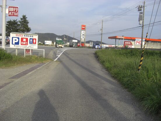 資料では関西電力の電柱置き場のあった分岐を左に折れて国道に出て、右に折れ暫く国道を重複するようになっています。そして国道の右にドライブイン富士・サンクスコンビニを右に見て、国道より右斜めに別れ数十mで十字路に合流しています。