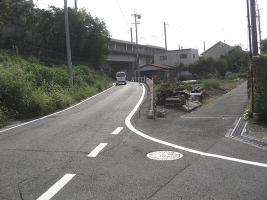 区間は200m足らずですが坂を登りながら左にカーブし、跨線橋となっているので、右側は擁壁の壁でその間の白線の30㎝内を歩きます。