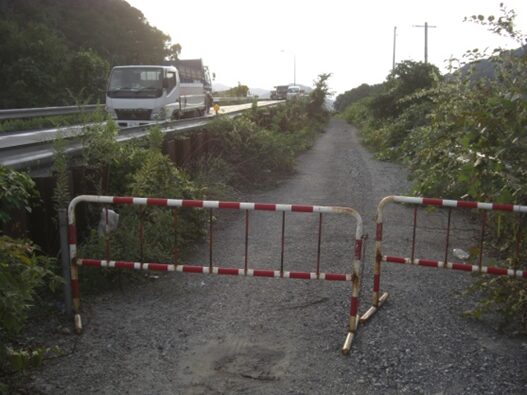 国道に出る手前に旧道が国道に沿って残っていましたが通行止めの柵がされています。でも国道は危険極まりないので少しでも歩きたくないと思ってるので、行けるだけ旧道を進もうとこの時点では助かったと思いましたが